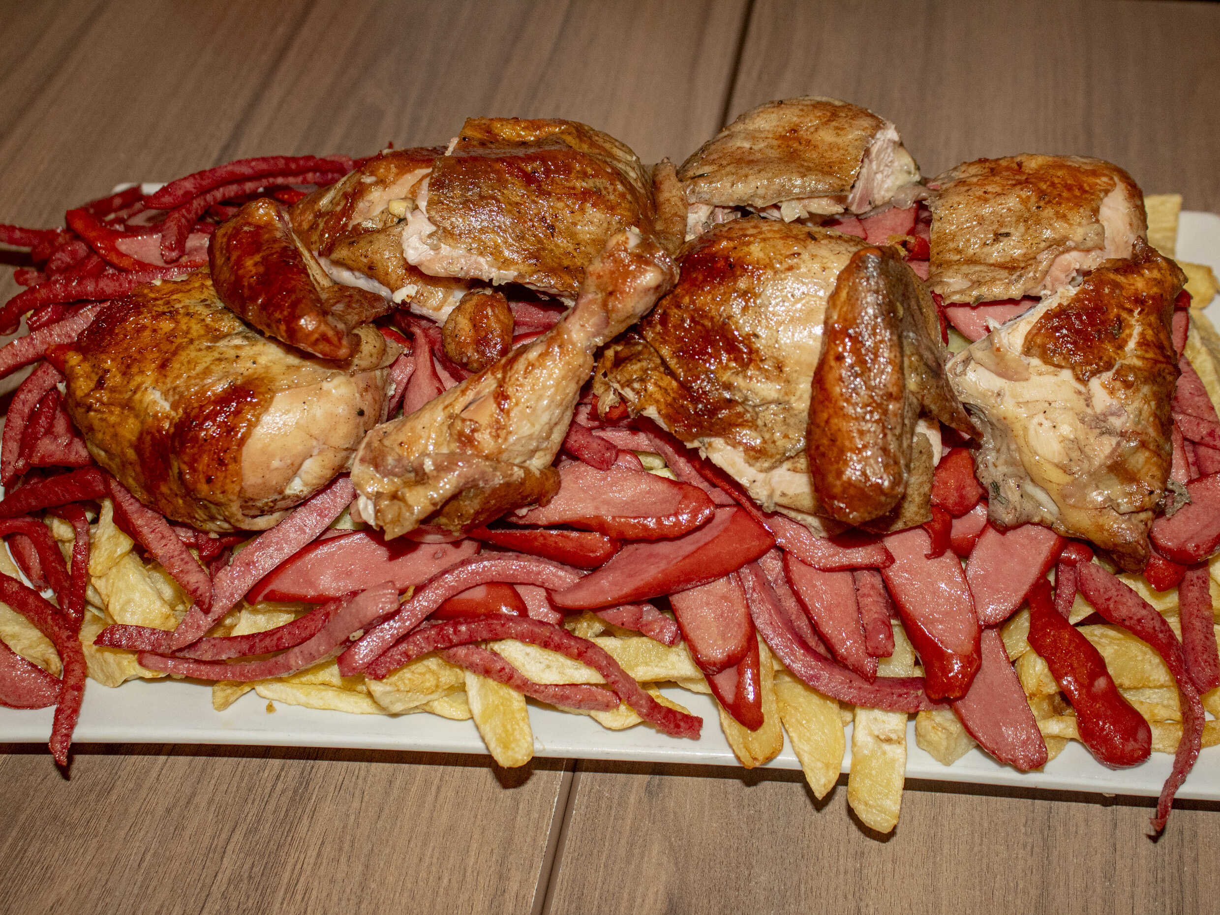 2 kg De papas fritas, 1/2 kg de hot dog, 1/2 kg de chorizo más 1 pollo a la brasa (8 octavos).