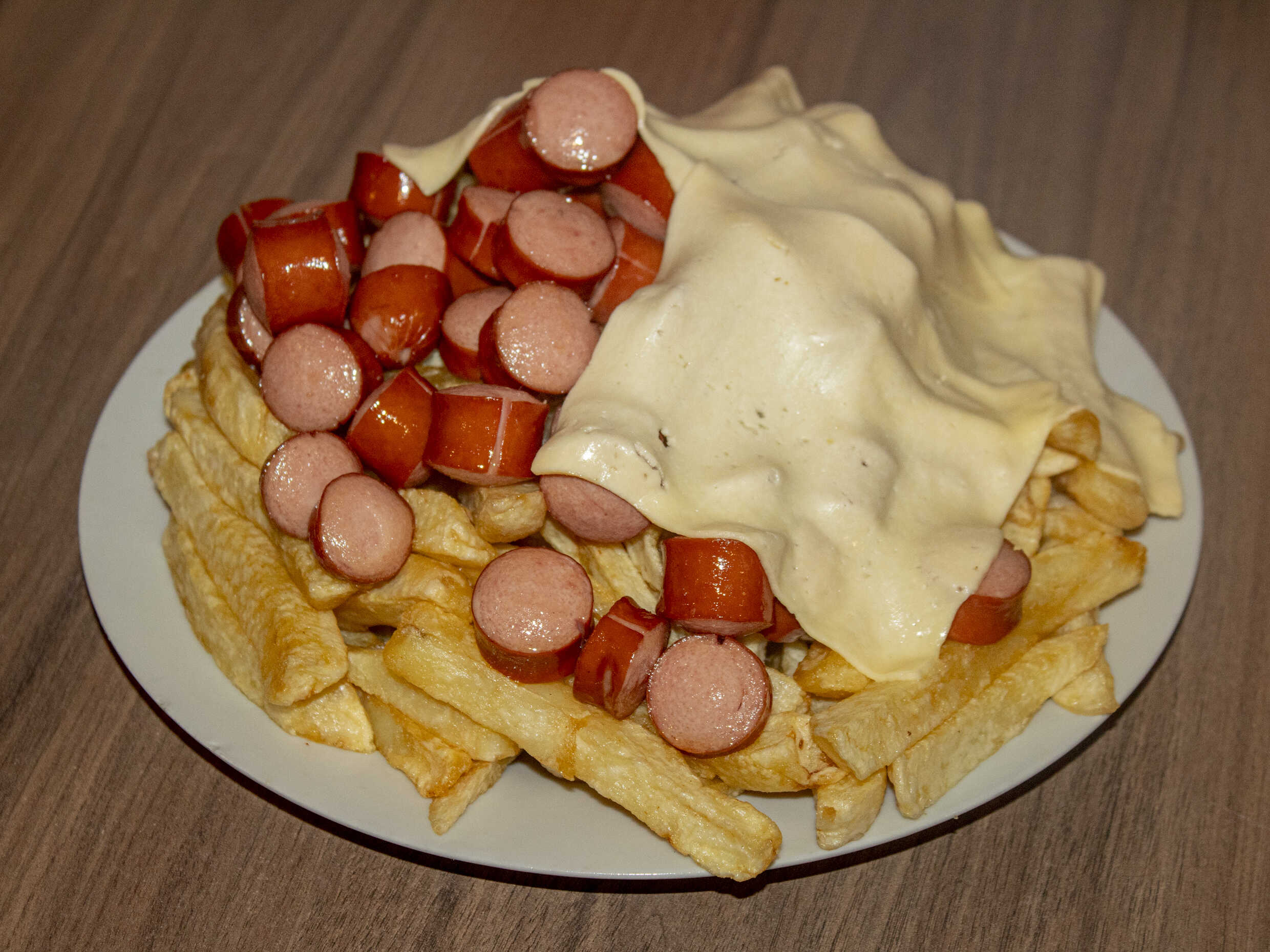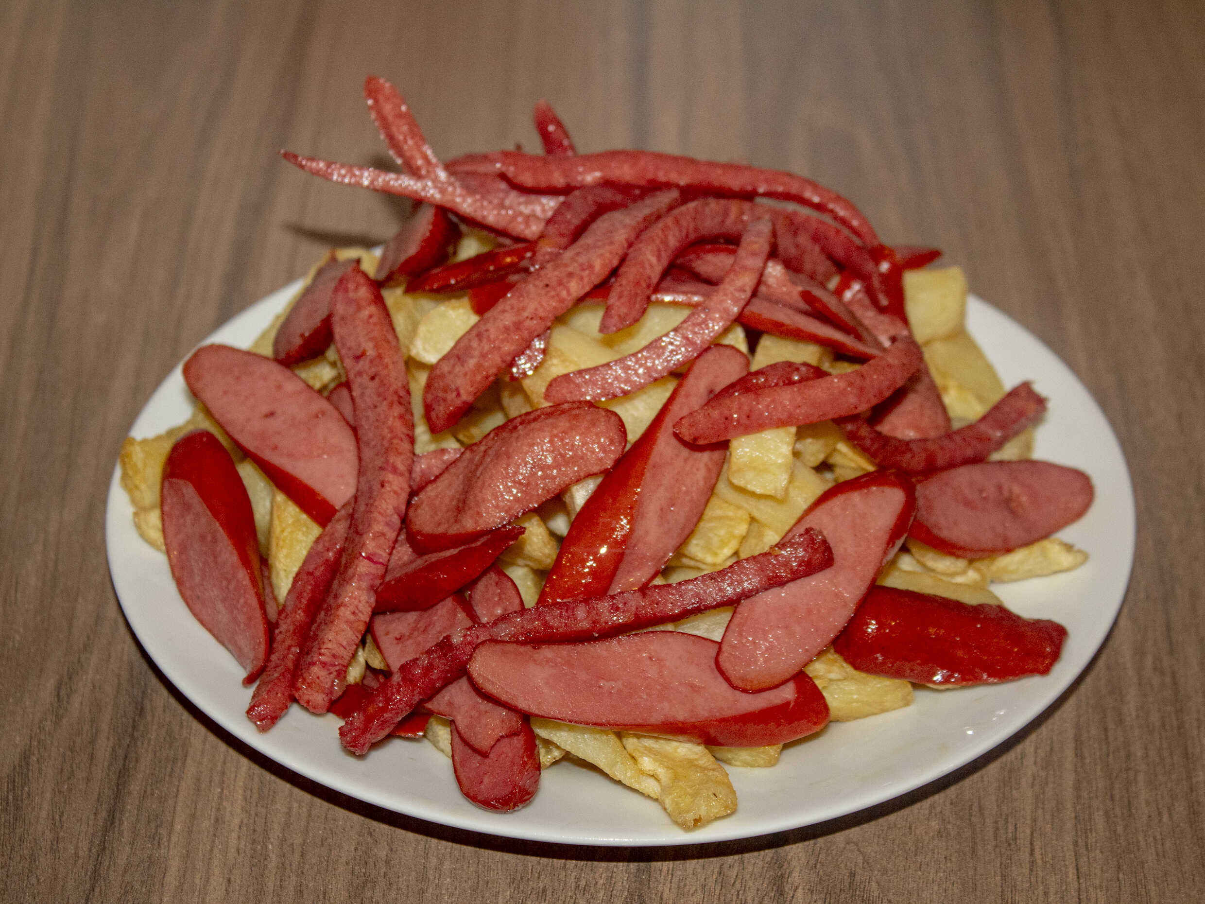 1 kg De papas, salchicha vienesa, 1/2 plátano frito en trozos más 250 g de queso mozzarella.