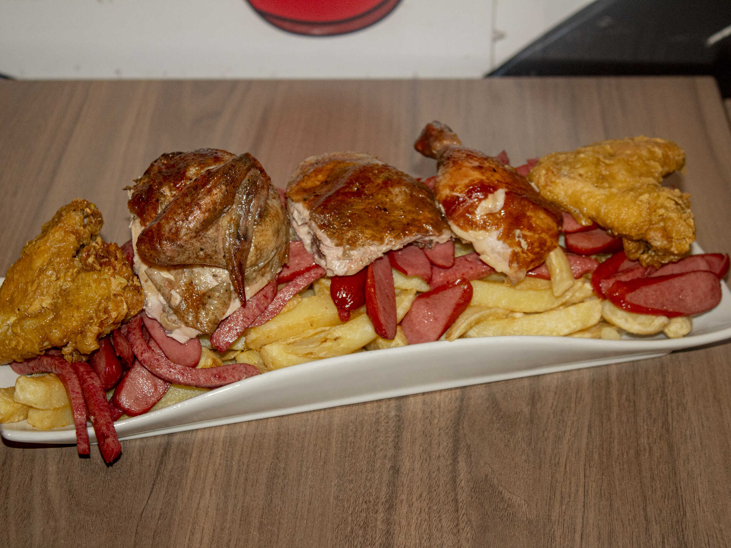 2 kg De papas fritas, 1/2 kg de hot dog, 1/2 kg de chorizo, 1/2 pollo a la brasa (4 octavos), 6 alas broaster más docena de alitas BBQ.
