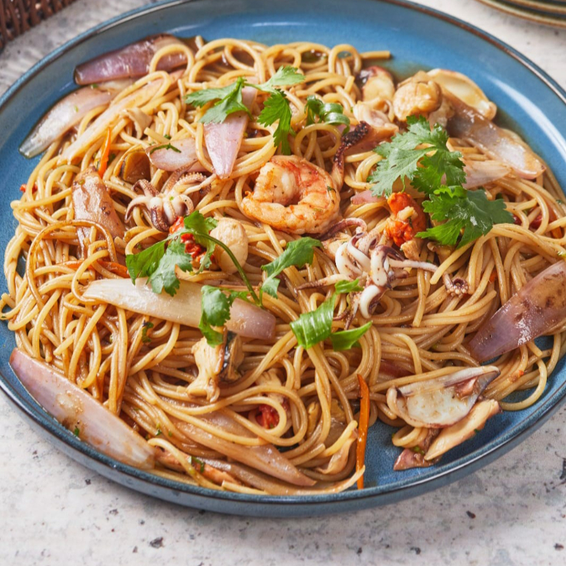 Espagueti salteado al wok a fuego alto con una mezcla de mariscos de resultando jugoso y ahumado.