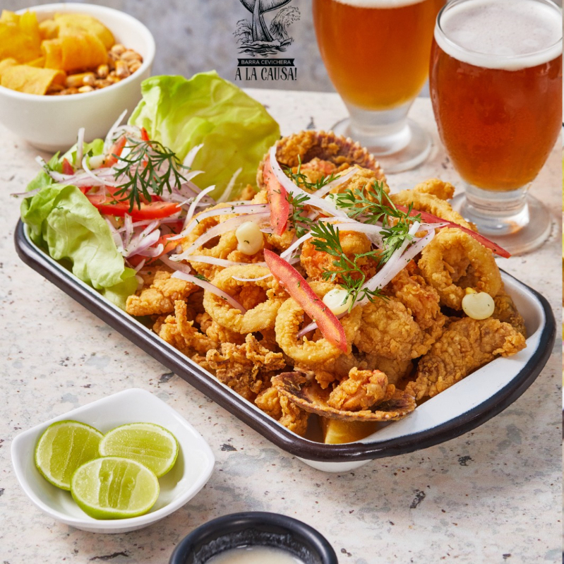 Base de yuquitas fritas, chicharrón de pescado, chicharrón de pota, mixtura de mariscos , 2onz de jugo de ceviche y sarsa criolla.