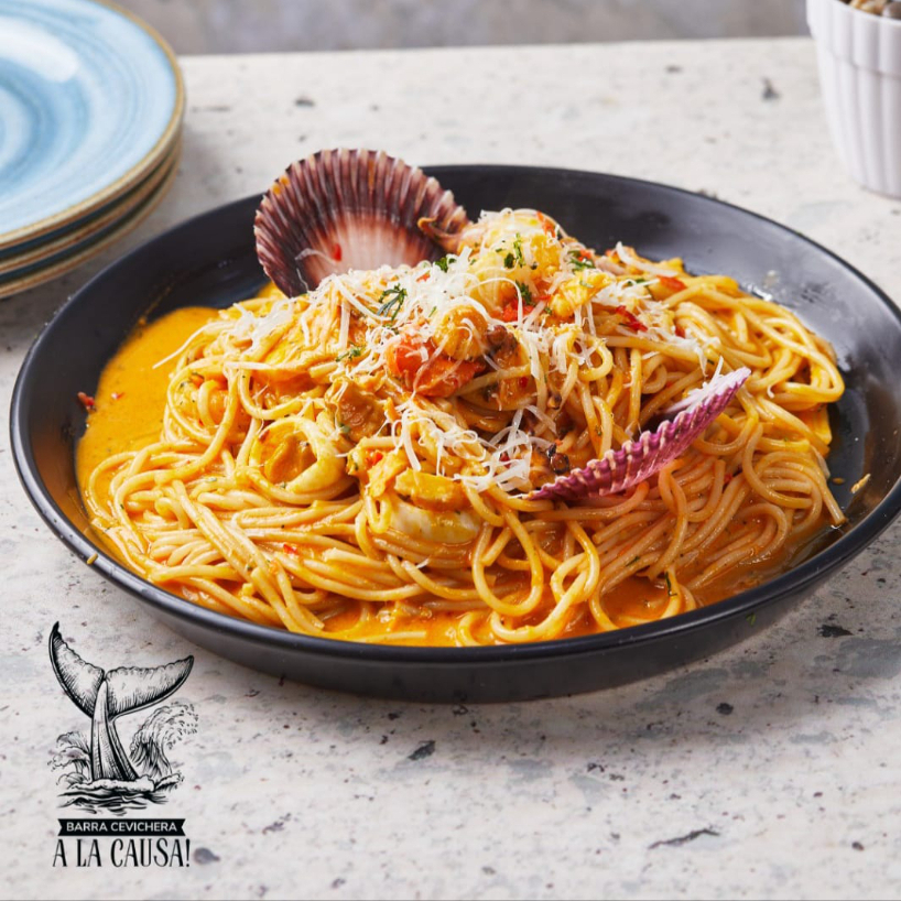 Espagueti bañado en salsa de mariscos frescos y decorado con parmesano.