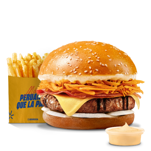 Hamburguesa de carne de res, tocino, papas al hilo y mayonesa de chimichurri. Foto referencial. BEMBOS SAC RUC 20101087647