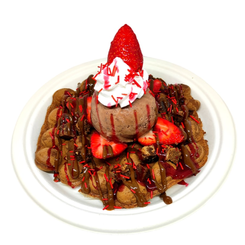 Waffle de chocolate con trozos de fresa, chantilly, bola de helado a elección, fudge y grageas rojas.