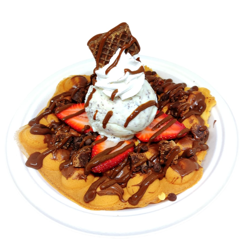 Waffle con crema de avellanas, brownie bites, fresa, chantilly, fudge y una bola de helado a elección.