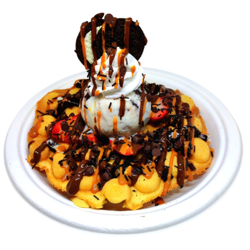 Waffle con sabor a vainilla con rodajas de fresa, oreo troceado, fudge y una bola de helado a elección.
