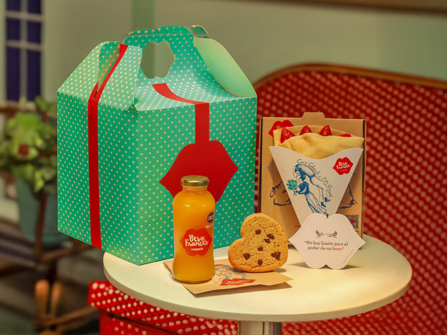 El precio de la promoción incluye 1 Crepe con Nutella, 1 bebida de fruta en botella, 1 bombón de chocolate en forma de beso y 1 avión de papel con un mensaje especial.