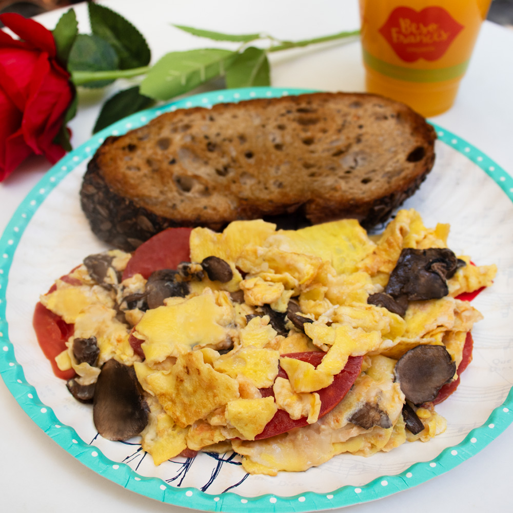 Huevo Revuelto relleno con queso, tomate y champiñones, y una tostada de pan multigrano de masa madre.