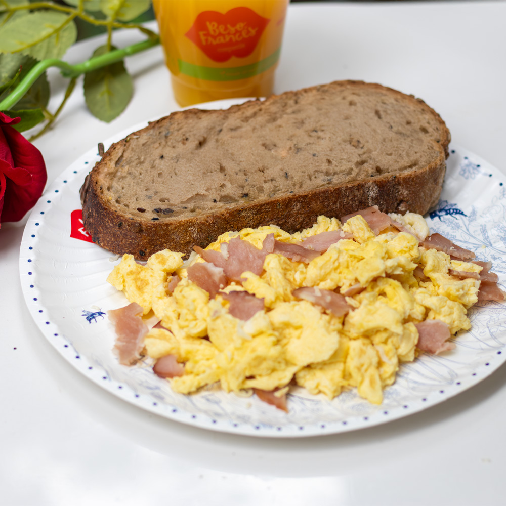 Huevo revuelto (3 huevos) acompañado de jamón, queso, y una tostada de pan de masa madre.