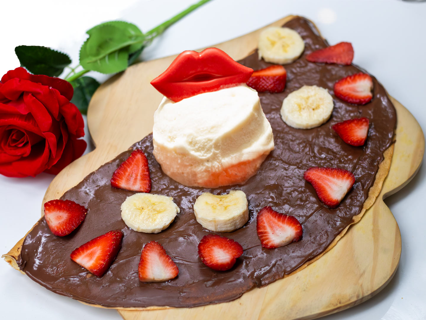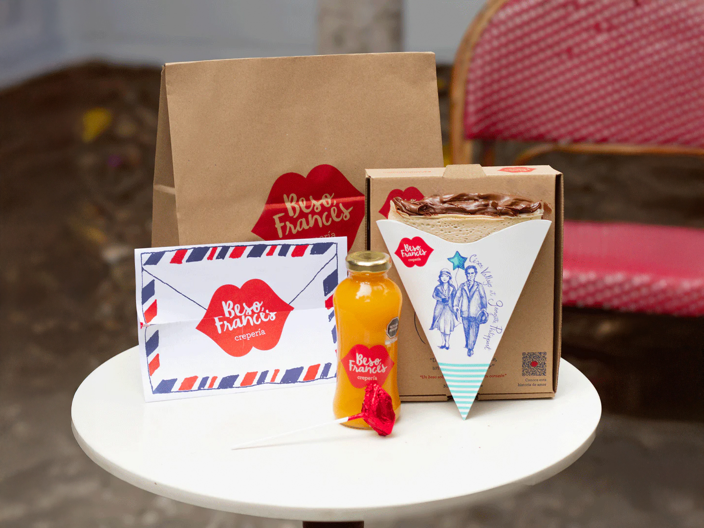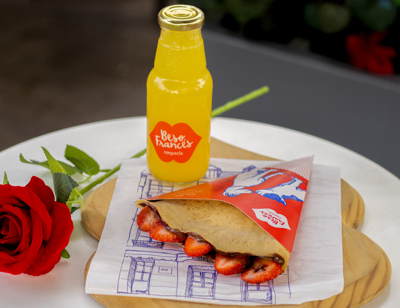 El precio de la promoción incluye 1 Crepe con Nutella, 1 bebida de fruta en botella, 1 bombón de chocolate en forma de beso y 1 carta con el fragmento de un verso romántico.