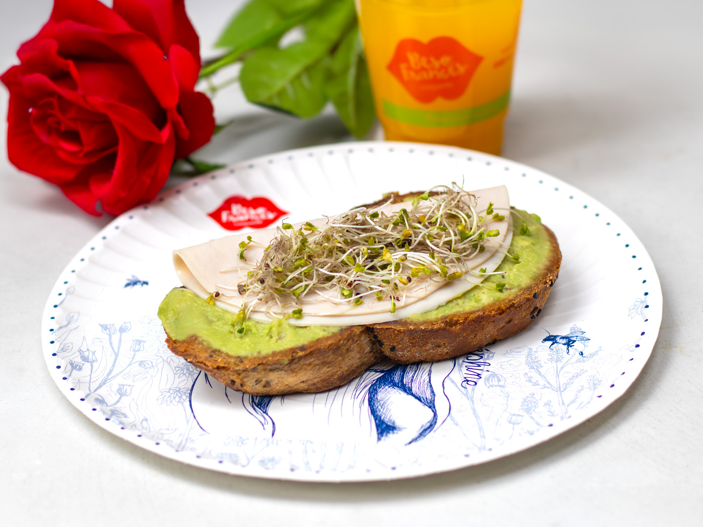 Tostón con palta y jamón de pavo, en pan de masa madre.
