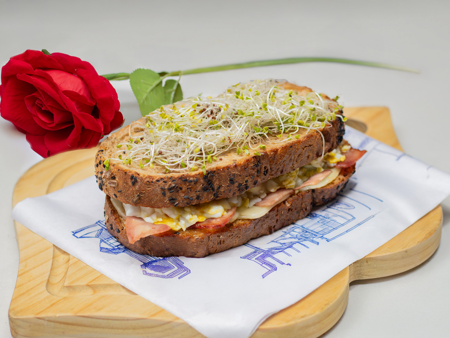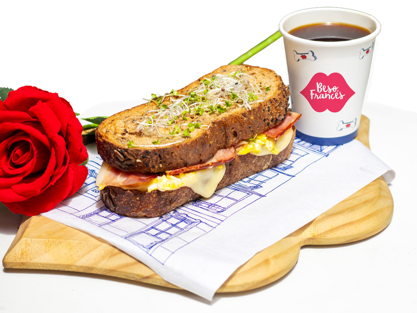 El precio de la promoción incluye 1 Sándwich de huevo, tocino y queso en pan de masa madre + 1 café americano de 8 oz.