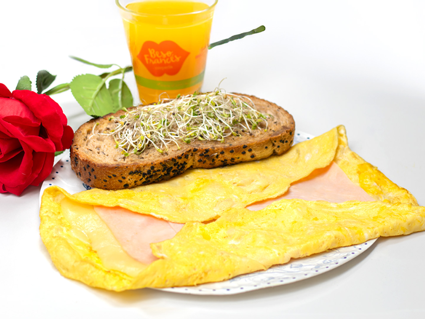 Omelette (3 huevos) relleno con jamón y queso, y una tostada de pan de masa madre.