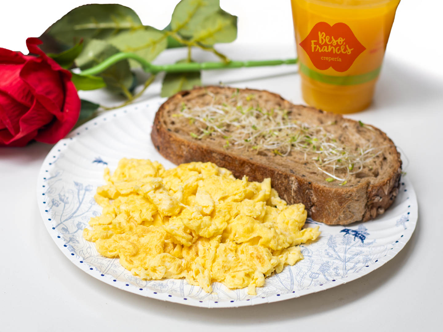 Huevo revuelto (3 huevos) y una tostada de pan de masa madre.