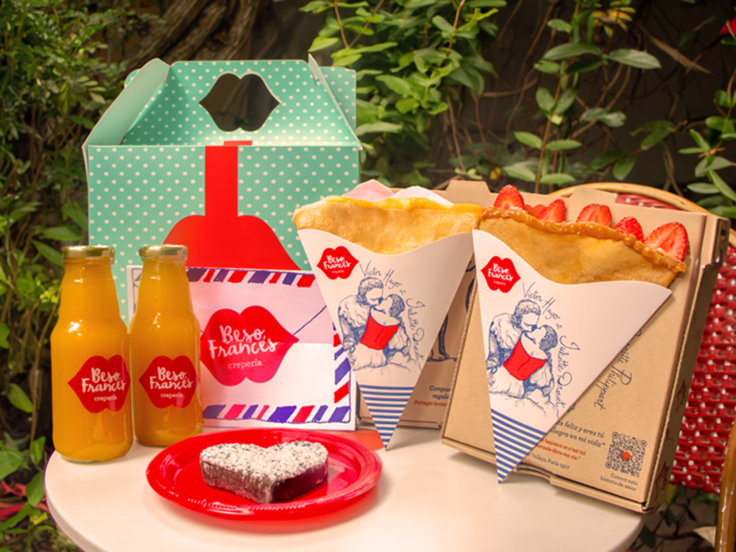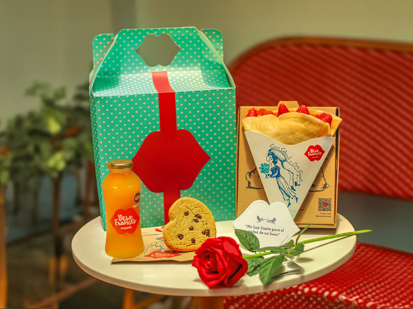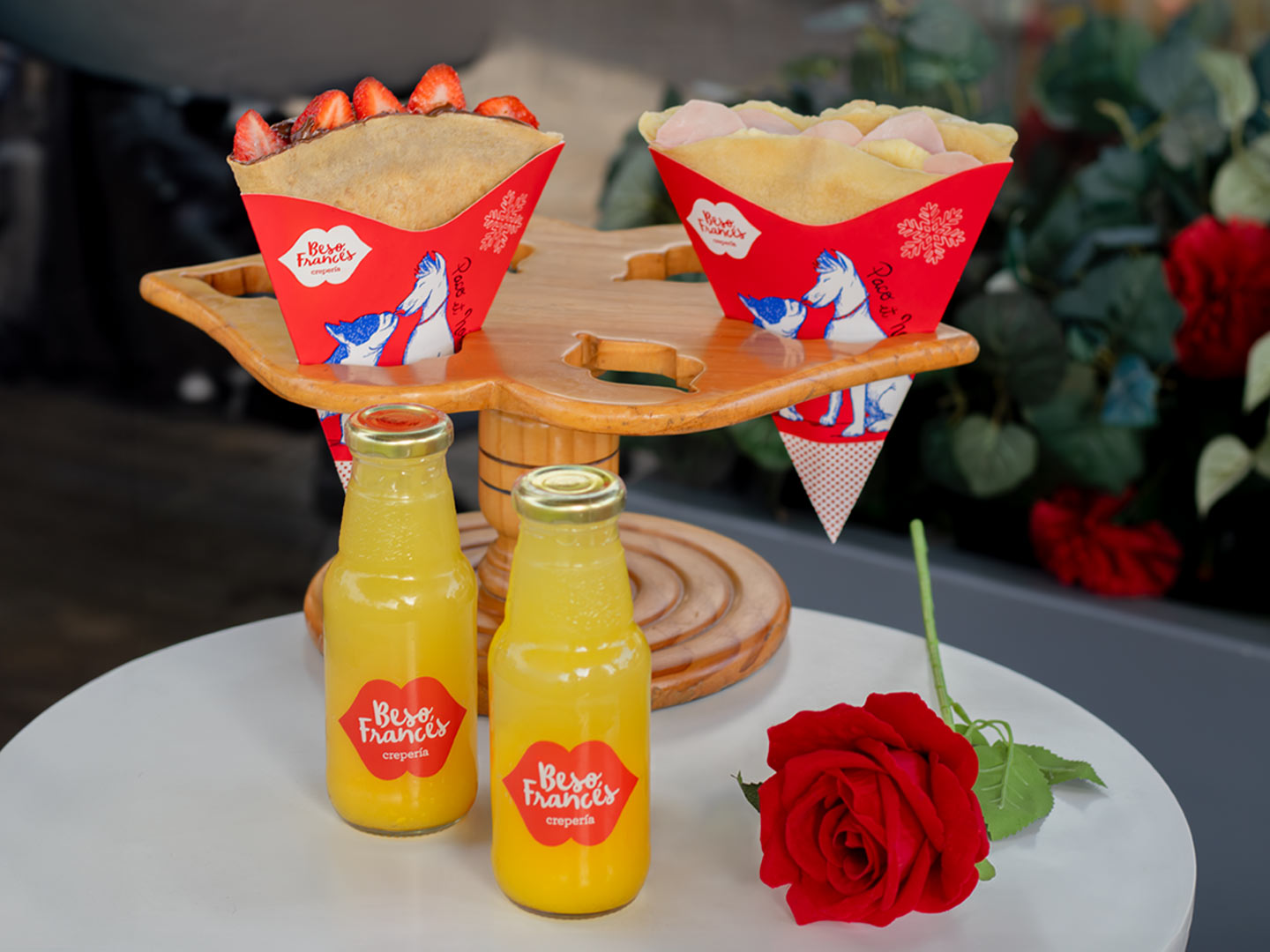 La promoción incluye 1 crepe con manjar acompañado de fresas y 1 crepe de jamón y queso, 2 botellas nectar tropical, 1 brownie y 1 carta con el fragmento de un verso romántico.