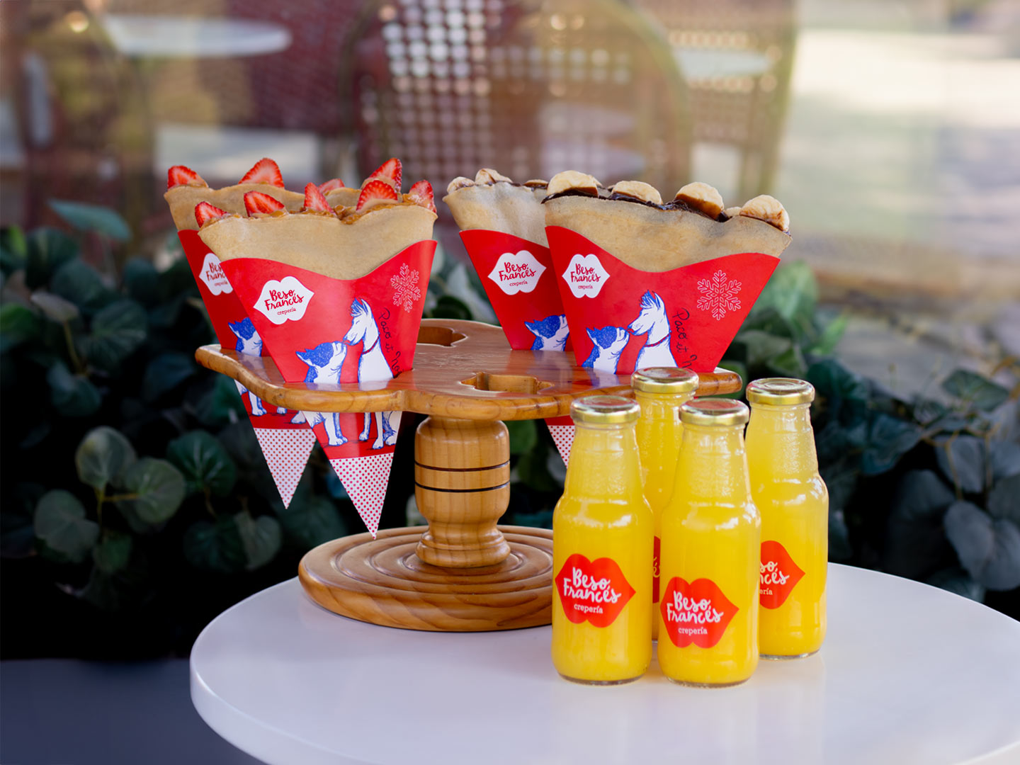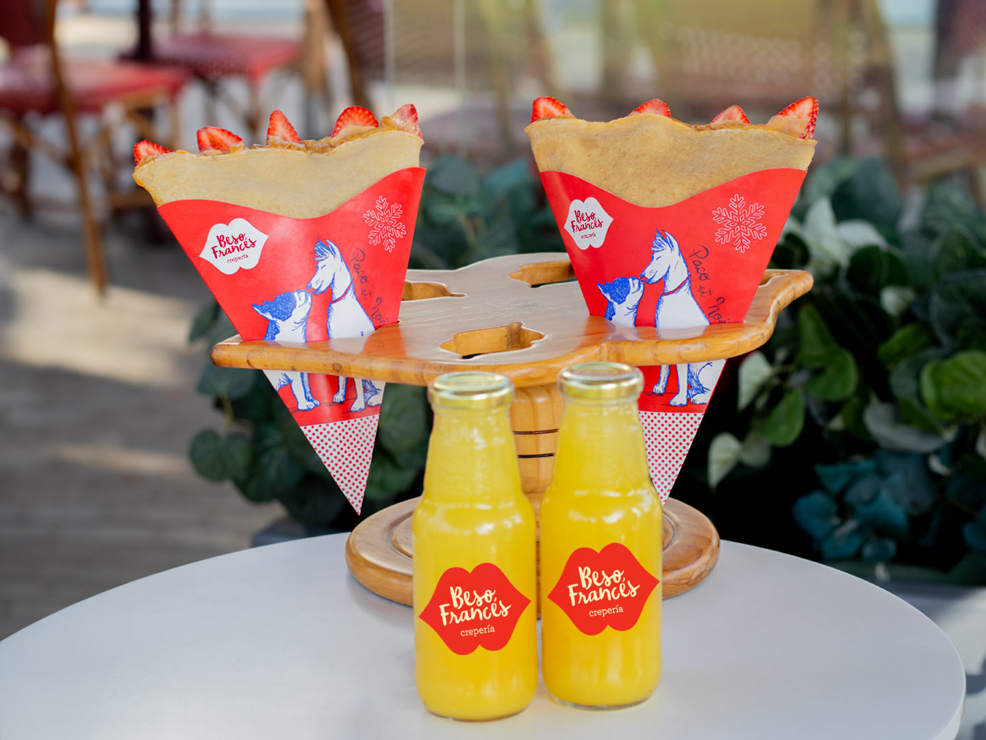 Disfruta de 1 crepe de jamón y queso + 1 crepe de Nutella con fresas + 2 botellas de jugo de naranja