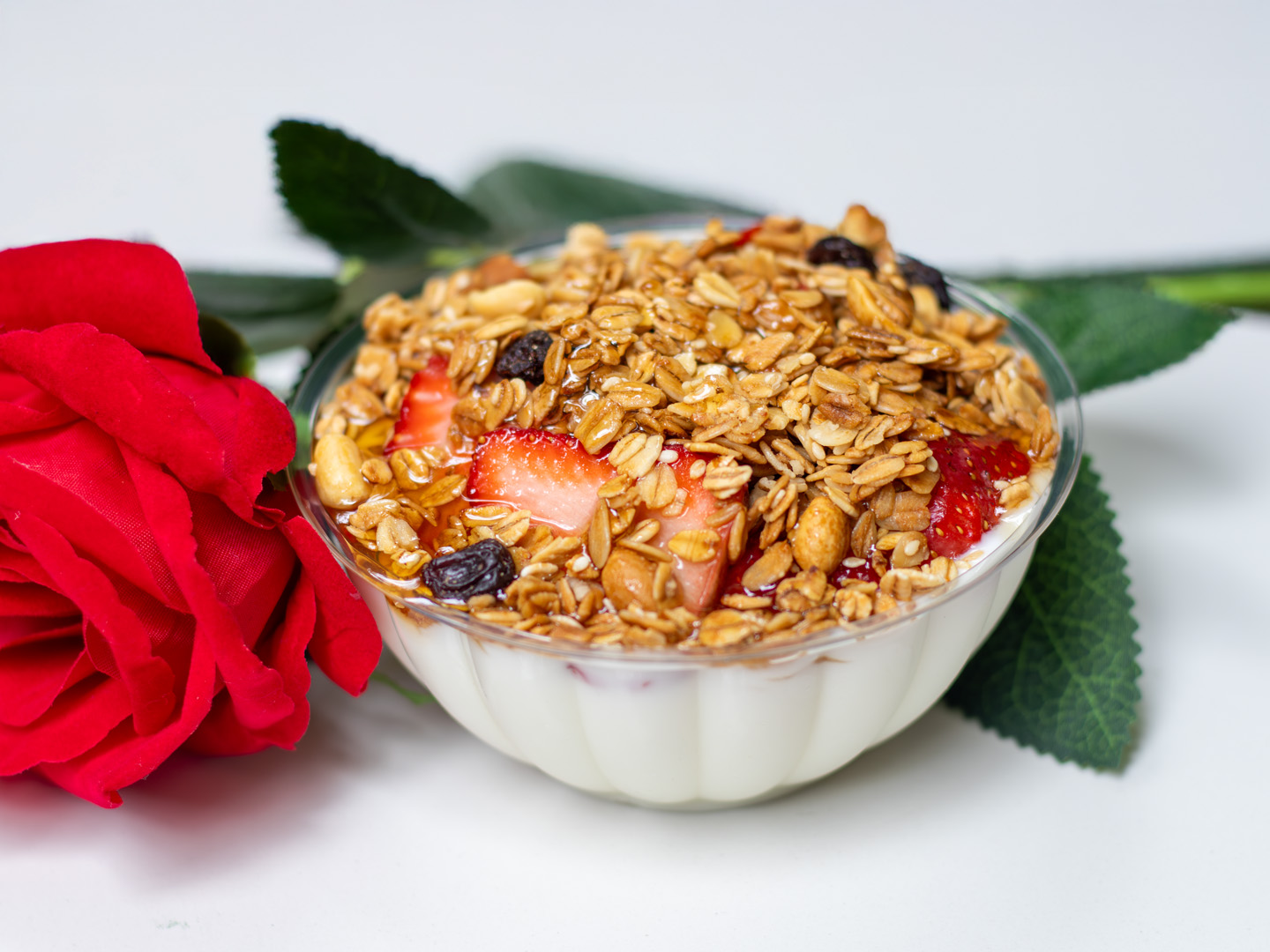 Bowl de yogurt griego cremoso con fresas, arándanos, granola crujiente y miel. Una opción saludable, balanceada y deliciosa para cualquier momento del día.