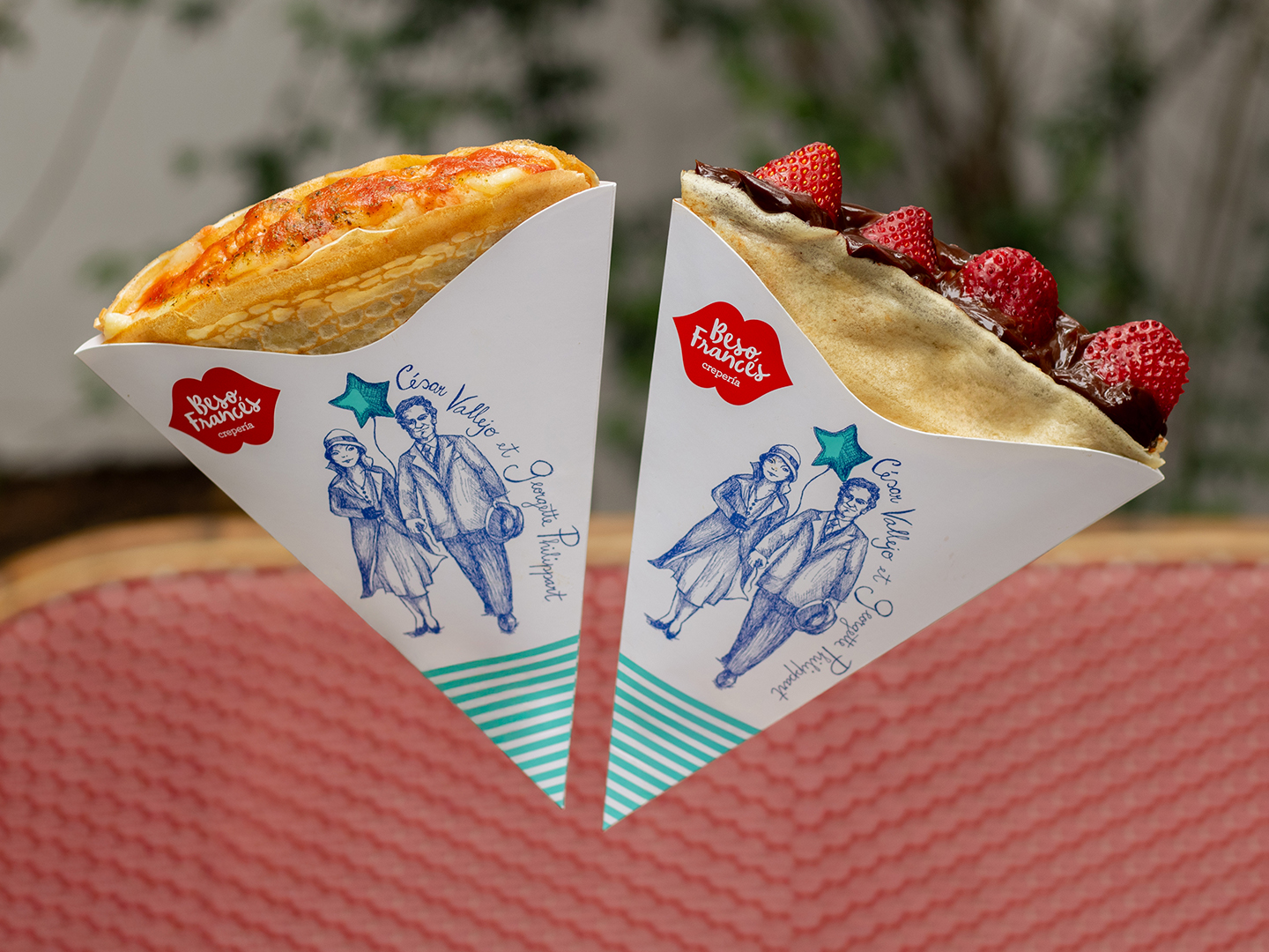 El precio de la promoción incluye 1 crepe con queso, salsa de tomate y orégano, 1 crepe con fudge acompañado de fresa o plátano.
