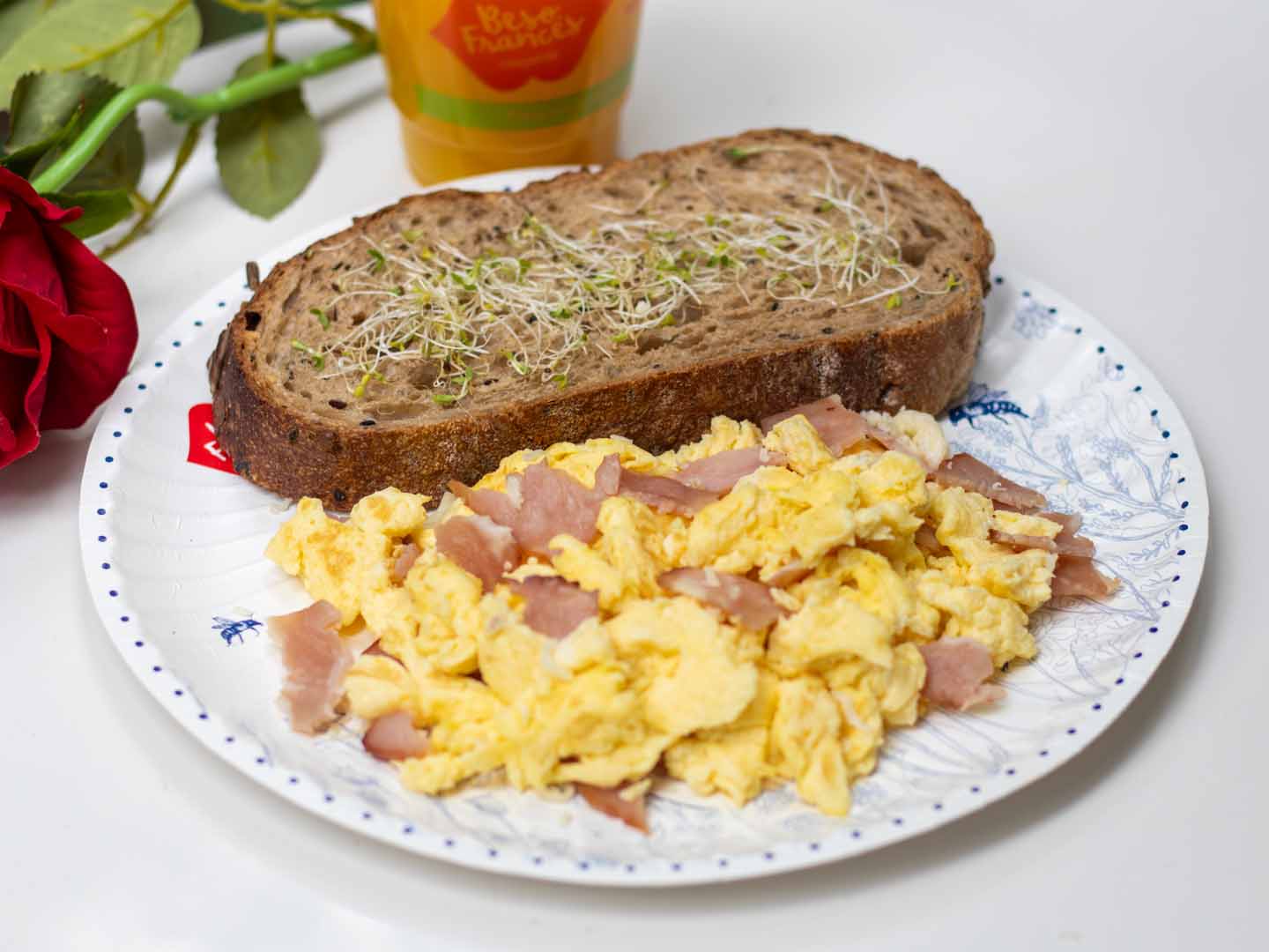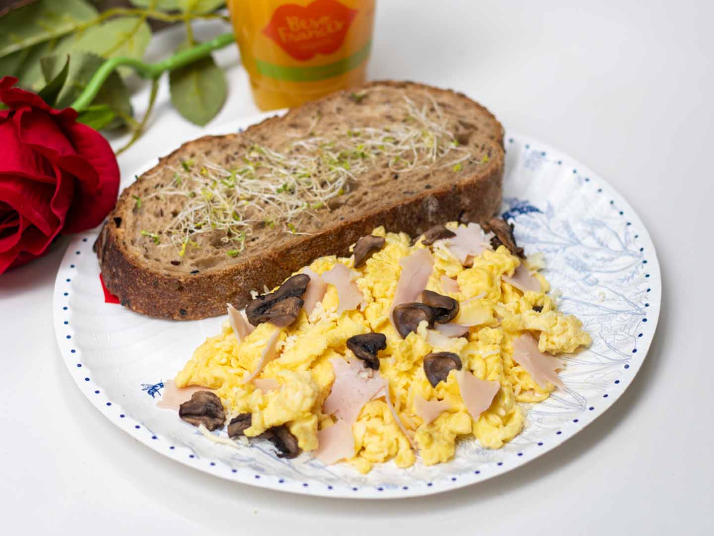 Huevo revuelto (3 huevos) acompañado de jamón, queso, champiñones y una tostada de pan de masa madre.
