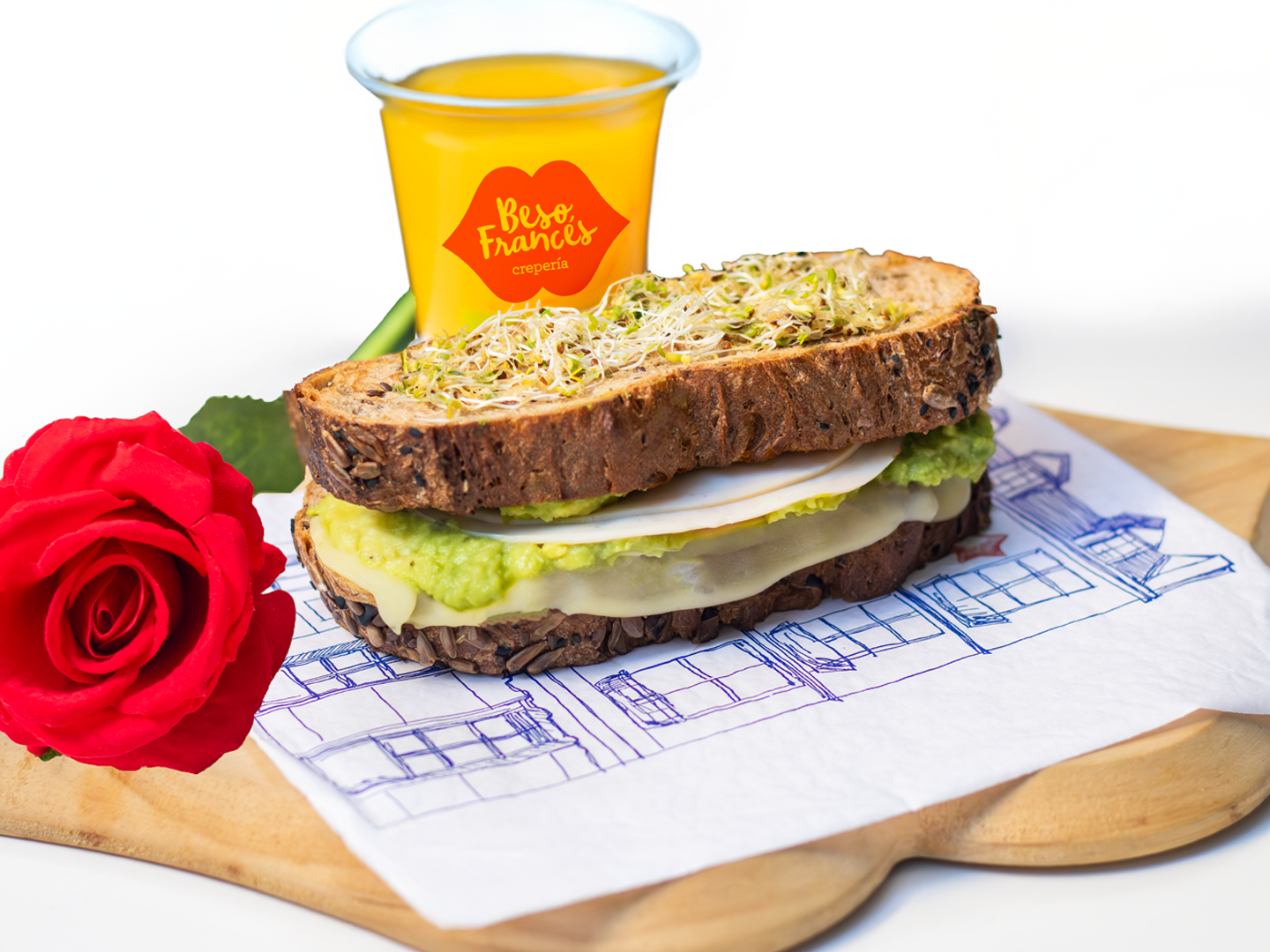 Sándwich relleno con jamón de pavo, queso y palta, en pan de masa madre.