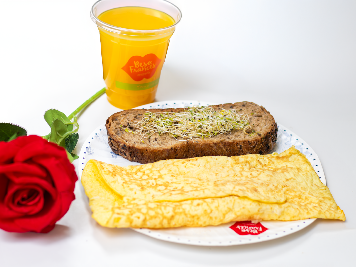Omelette (3 huevos) y una tostada de pan de masa madre.