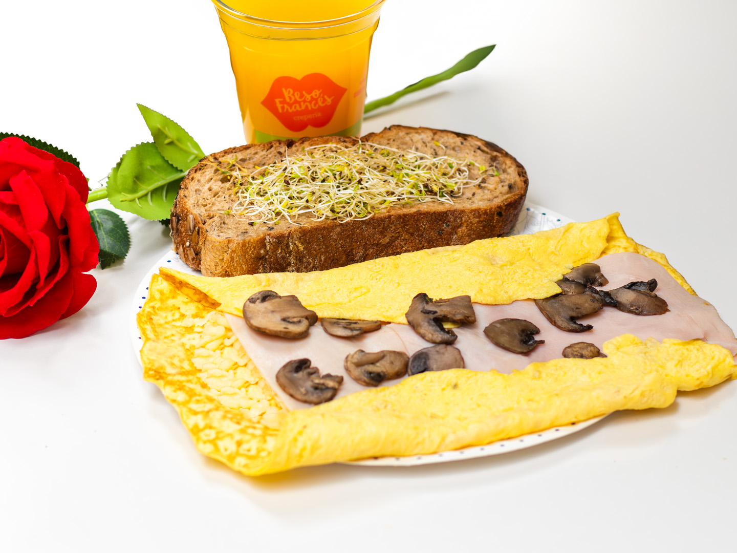 Omelette (3 huevos) relleno con jamón, queso y champiñones, y una tostada de pan de masa madre.