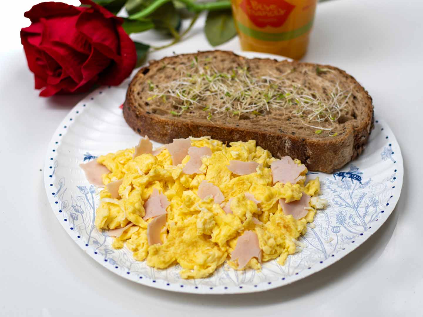 Huevo revuelto (3 huevos) acompañado de jamón, queso, y una tostada de pan de masa madre.