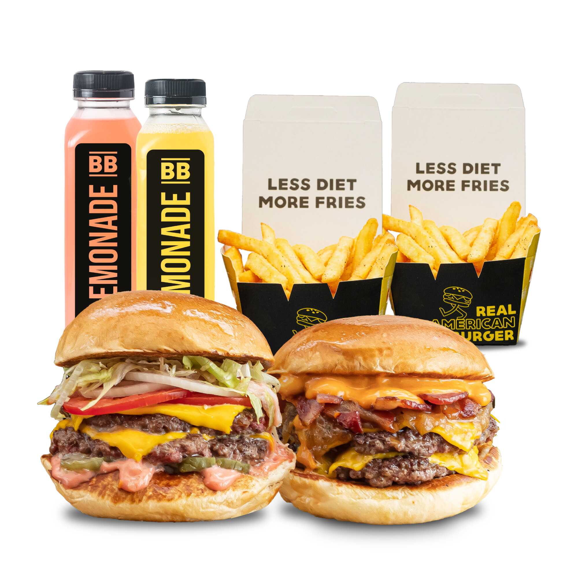 Dos burgers, dos fries, dos bebidas y salsas (mayonesa, ketchup y ají).