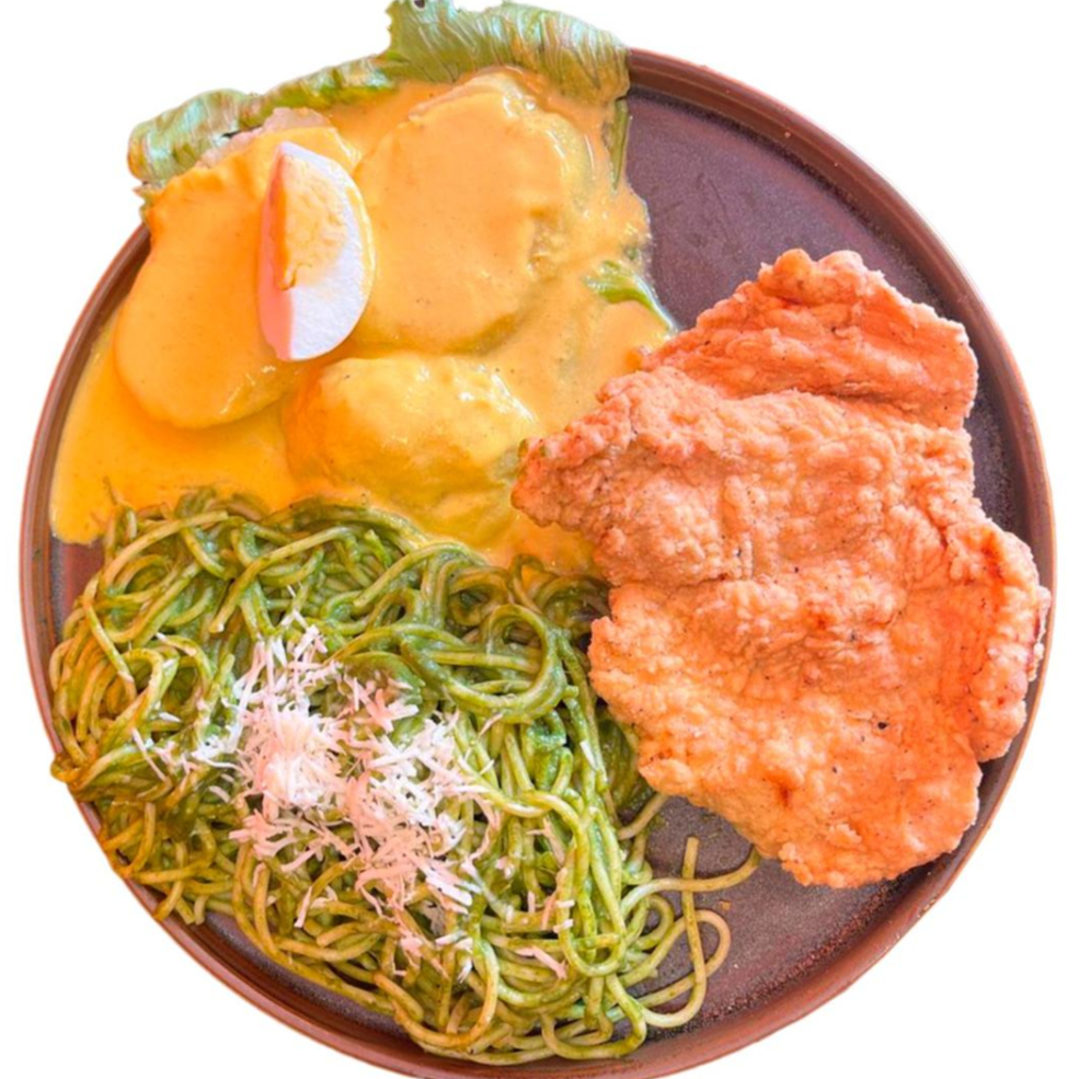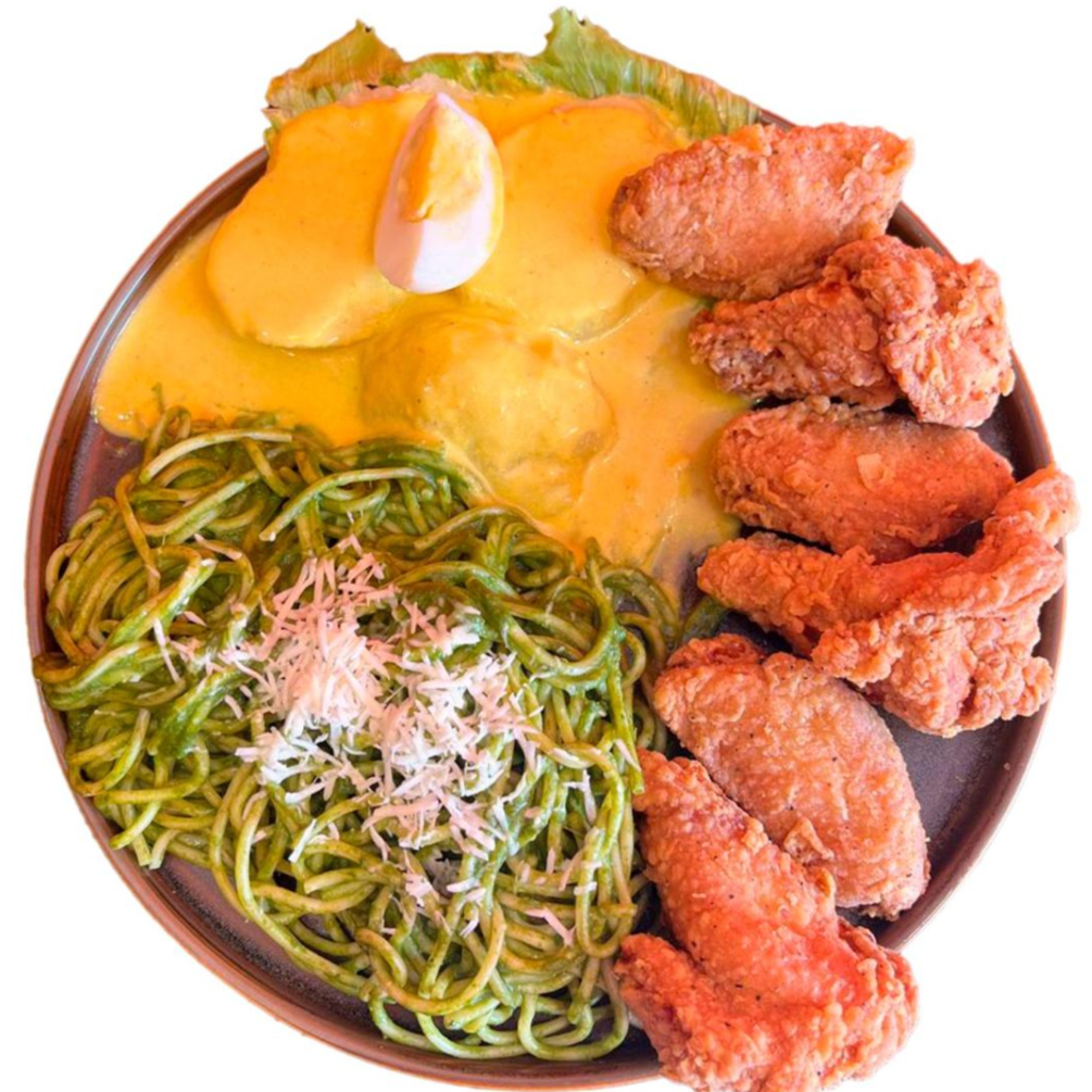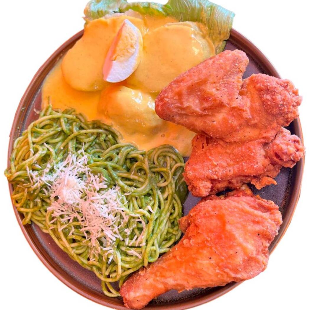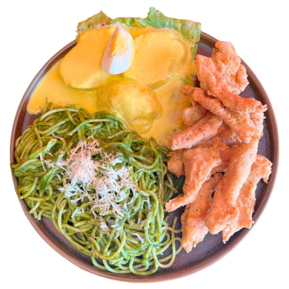 10 chicharrones, spaguetti al pesto, papa a la huancaína y salsas.