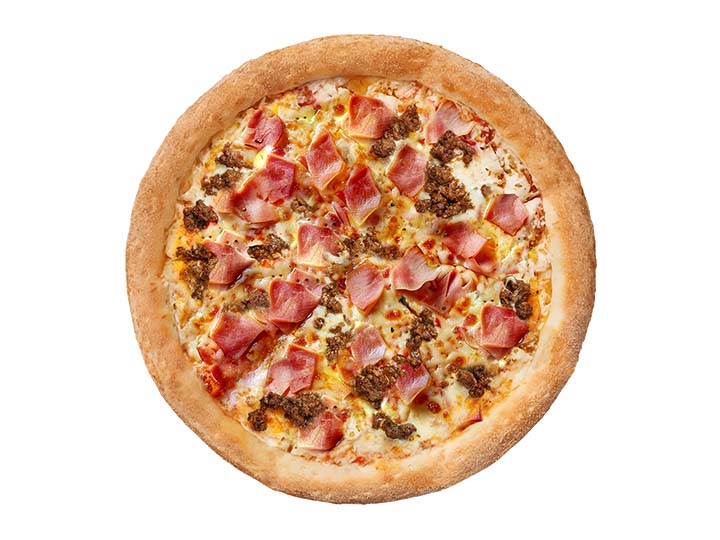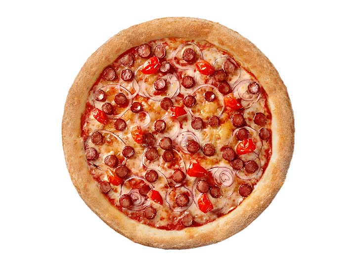 Chorizo ahumado y jamón inglés sobre mozzarella. Una pizza grande con sabor intenso.