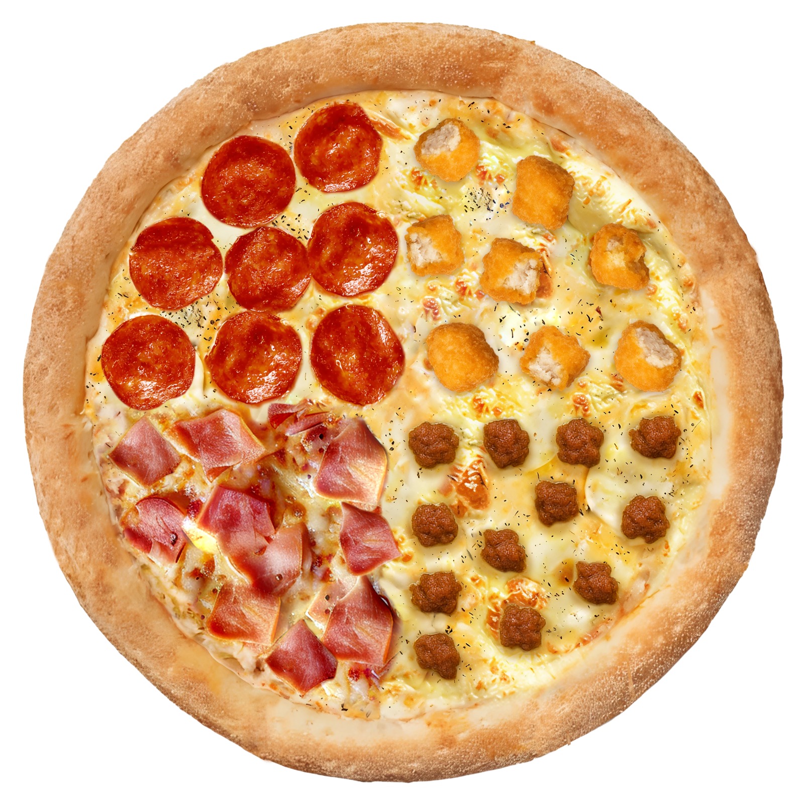 Pepperoni, hamburguesa, jamón inglés y pollo crujiente. Pizza solo para verdaderos carnívoros.