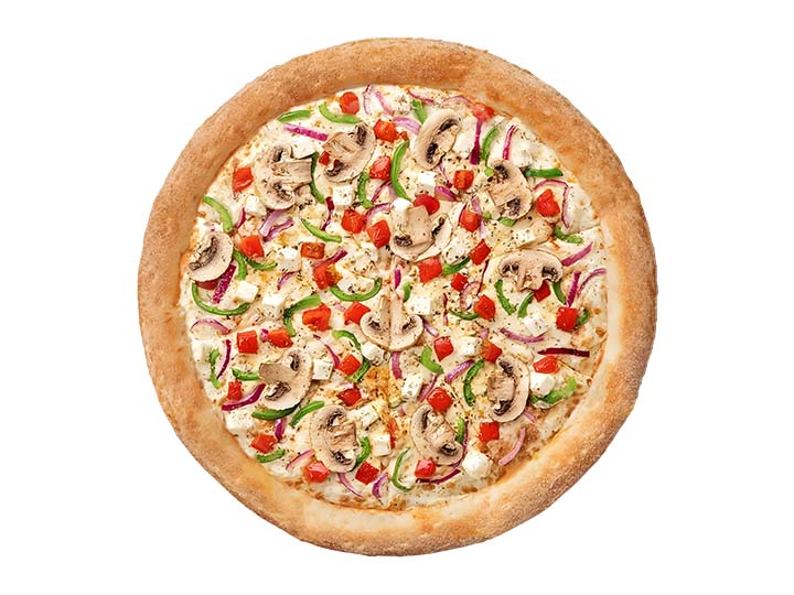 Champiñón, tomate fresco y aceitunas, 3 quesos: mozzarella, parmesano y cheddar, bordes crujientes y horneada a la piedra.