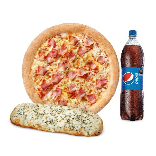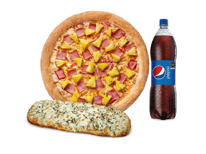 Pizza grande hawaiana, pan al ajo y Pepsi 750 ml .