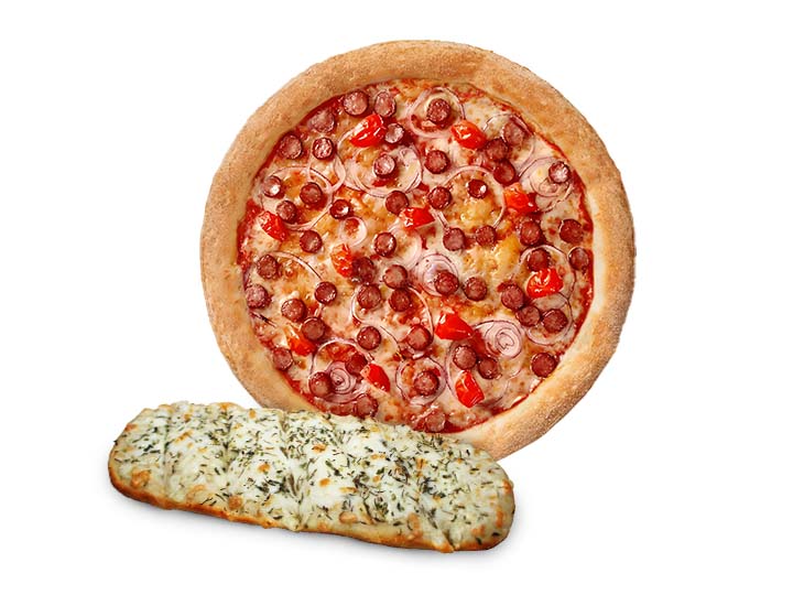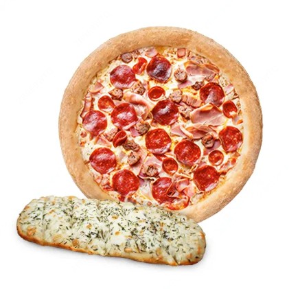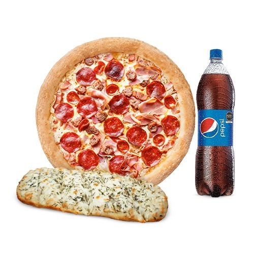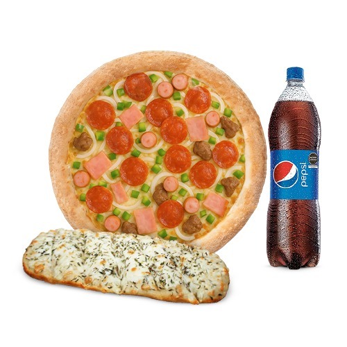 Pizza suprema, pan al ajo y Pepsi 750 ml.