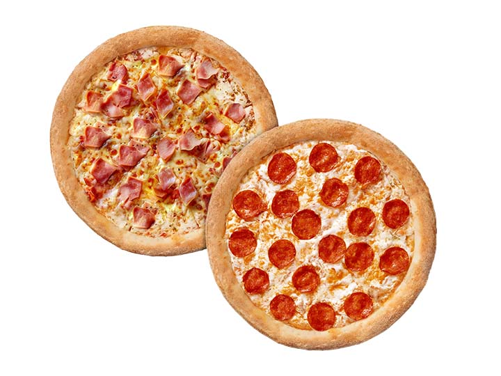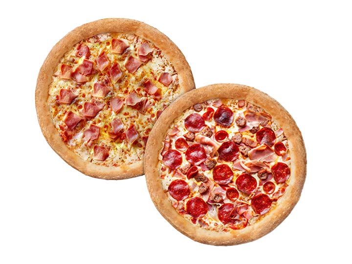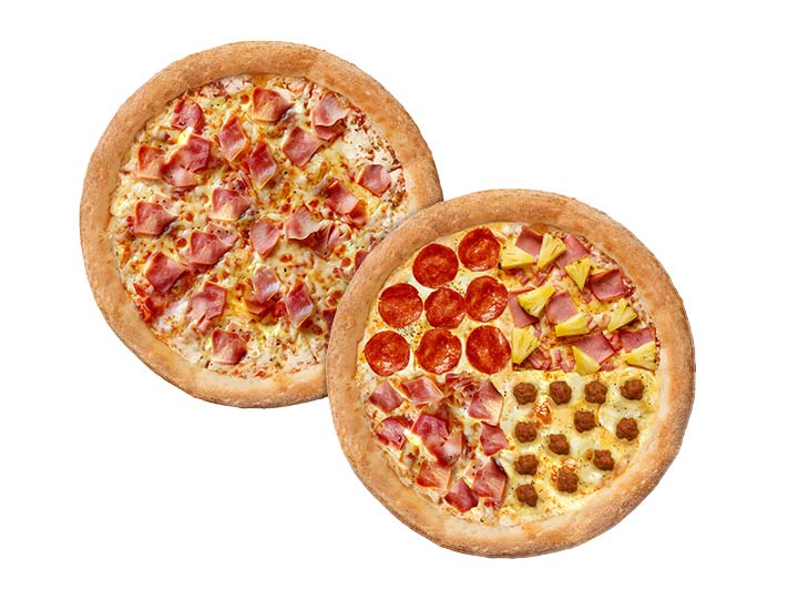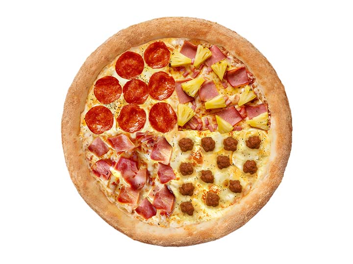 Una combinación de 4 sabores clásicos en una sola pizza grande: americana, hawaiana, pepperoni y hamburguesa.