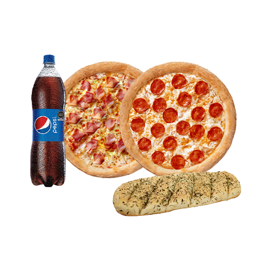 2 Pizzas grandes + Pan al ajo + Pepsi 750 (Pepperoni + Cheesy).