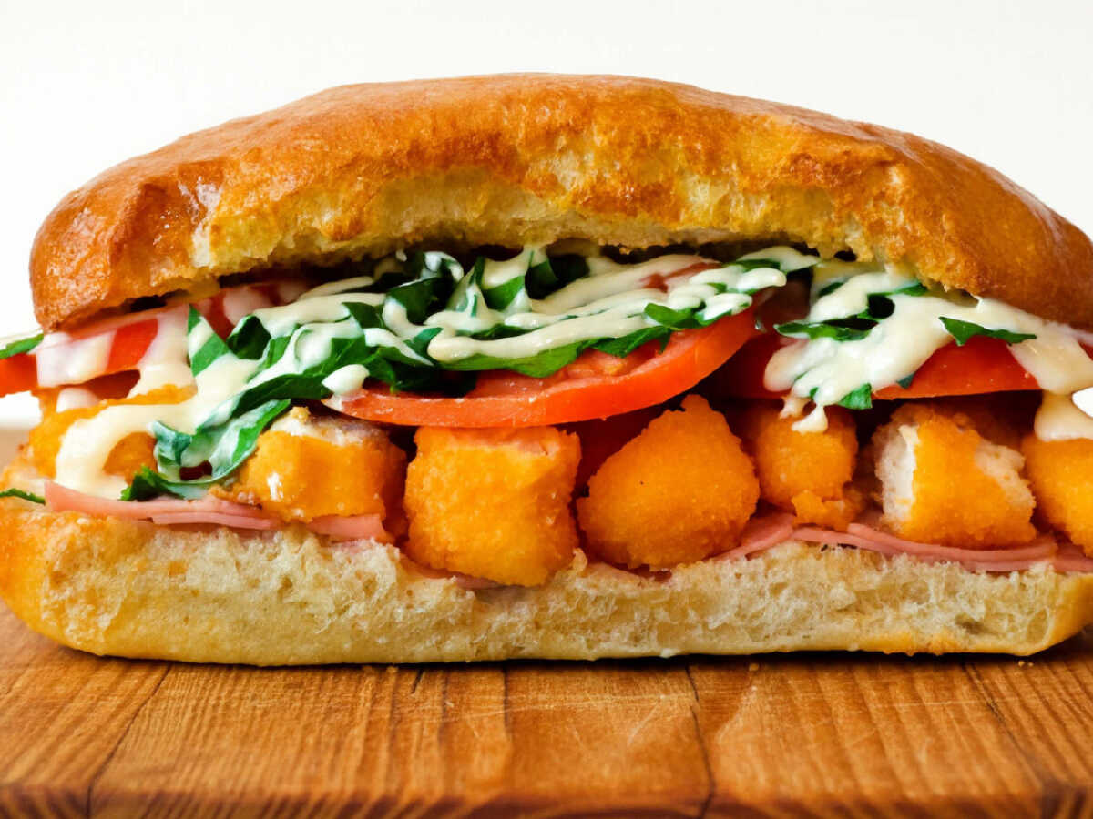 Mezcla perfecta entre pizza y sándwich: masa doradita con bondiola ahumada, jamón inglés, tomate, mozzarella y el toque fresco de crema alioli.