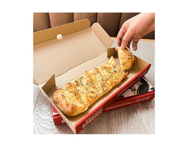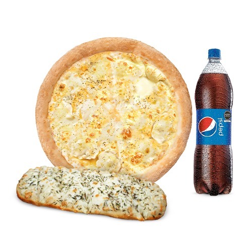 Pizza cheesy, pan al ajo y Pepsi 750 ml.