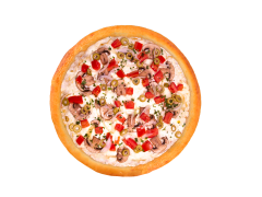 Champiñón, tomate fresco y aceitunas, 3 quesos: mozzarella, parmesano y cheddar, bordes crujientes y horneada a la piedra.