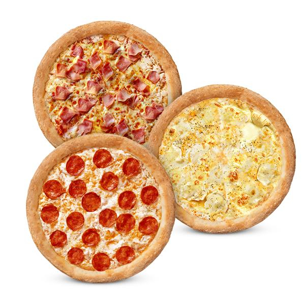 3 Pizzas grandes: Tropical Hawaiana + Cheesy American + Big Mozzarella.