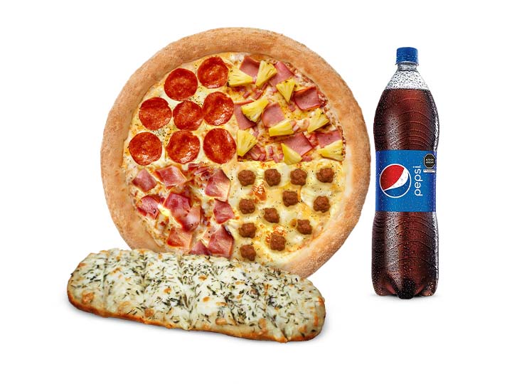 Pizza 4 en 1, pan al ajo y Pepsi 750 ml.