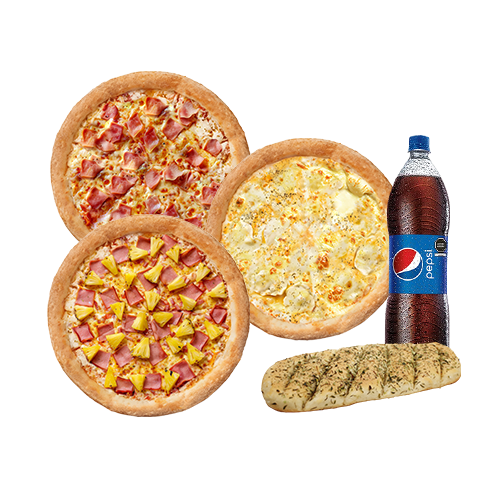 3 Pizzas grandes + Pan al ajo + Pepsi 750 (Tropical Hawaiana + Cheesy American + Big Mozzarella).