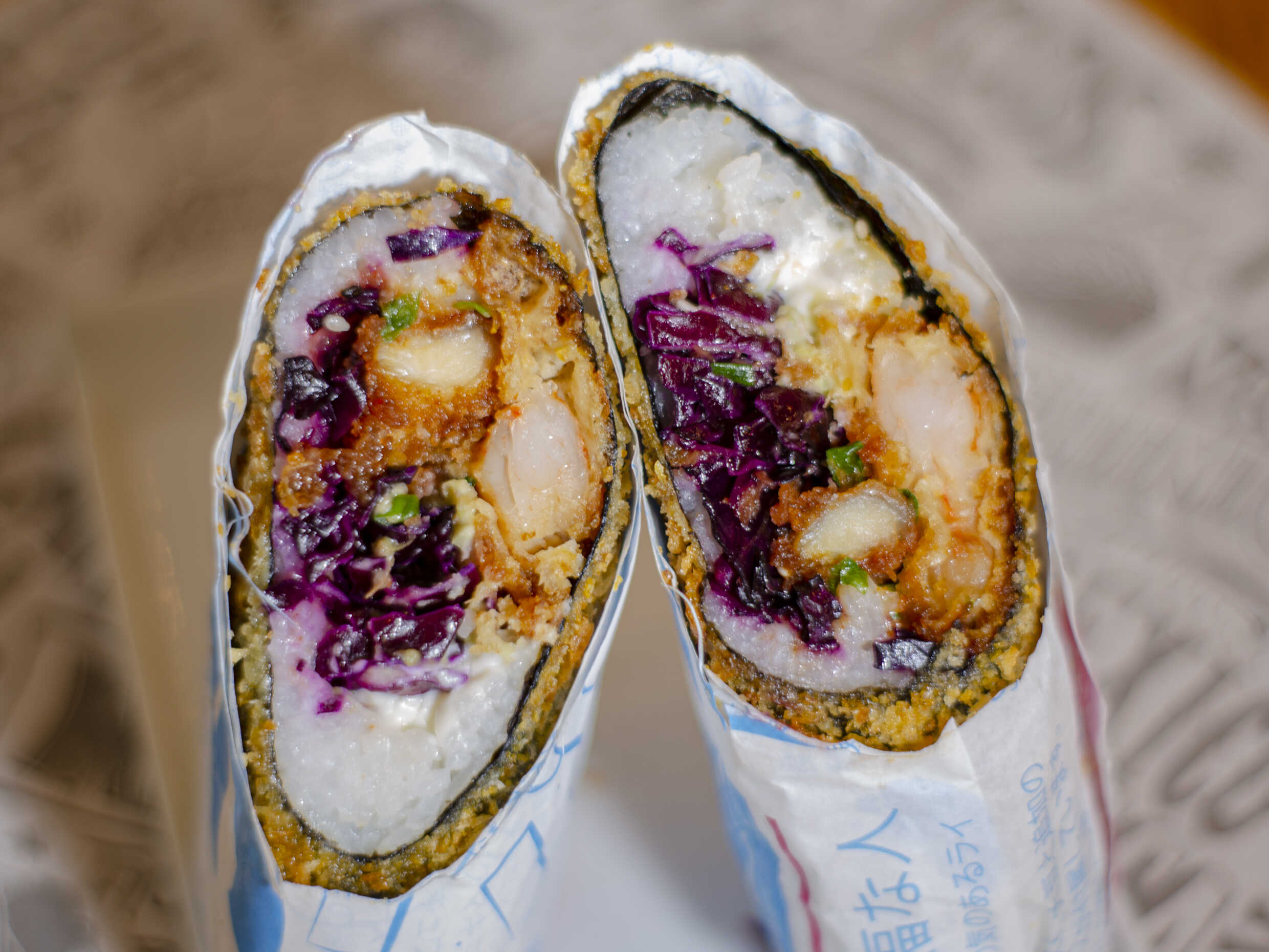 Pollo karaage bañado en korean BBQ, langostinos, semilla de ajonjolí, col morada, palta y queso crema. Todo envuelto en sushi sticky rice, ajonjolí negro, togarashi y alga nori. Empanizado todo por fuera y cebolla china.