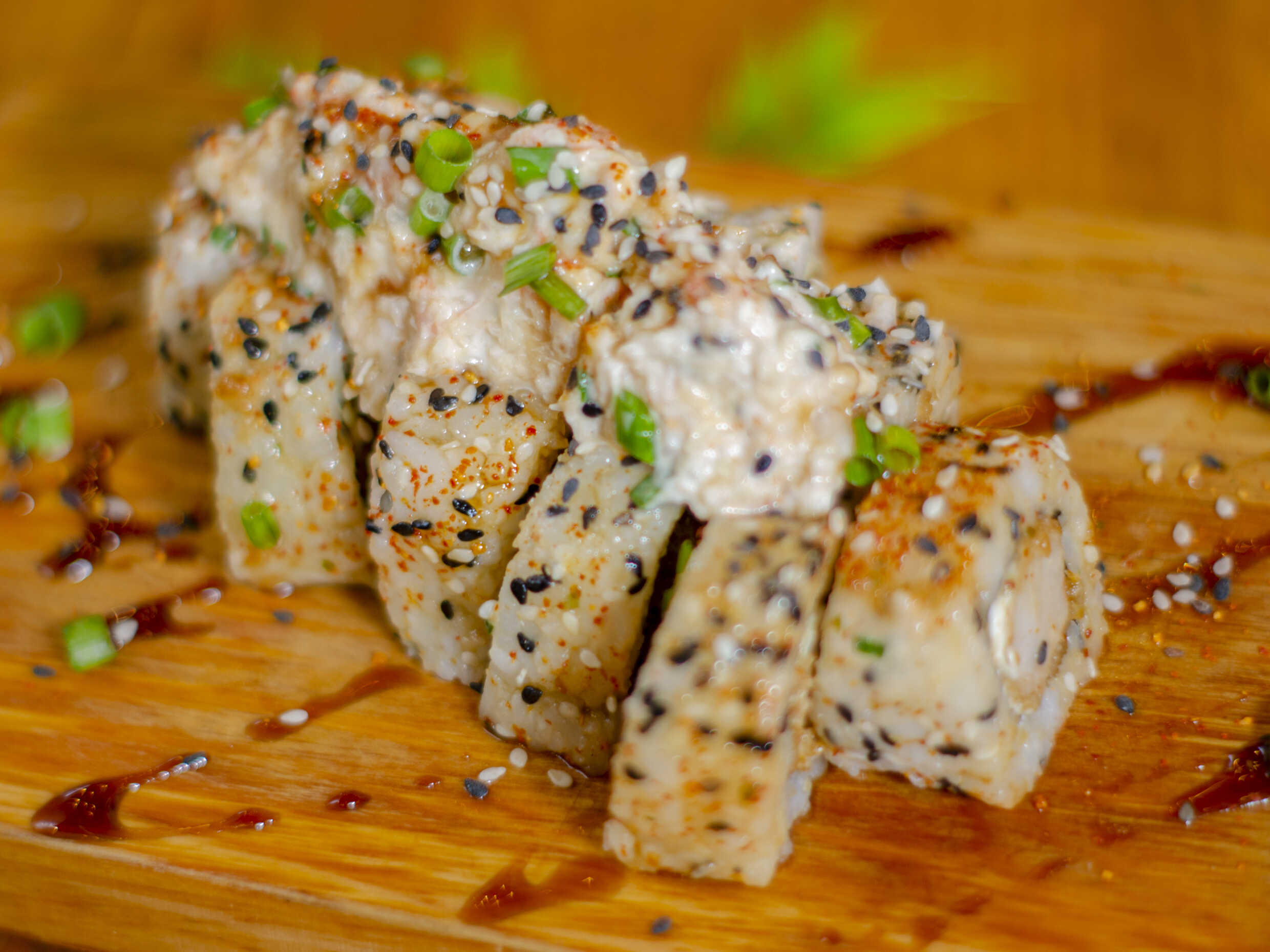 Pollo crispy, tartar de langostinos, queso crema, palta, empanizado por fuera estilo furai, bañado en korean BBQ y cebolla china.