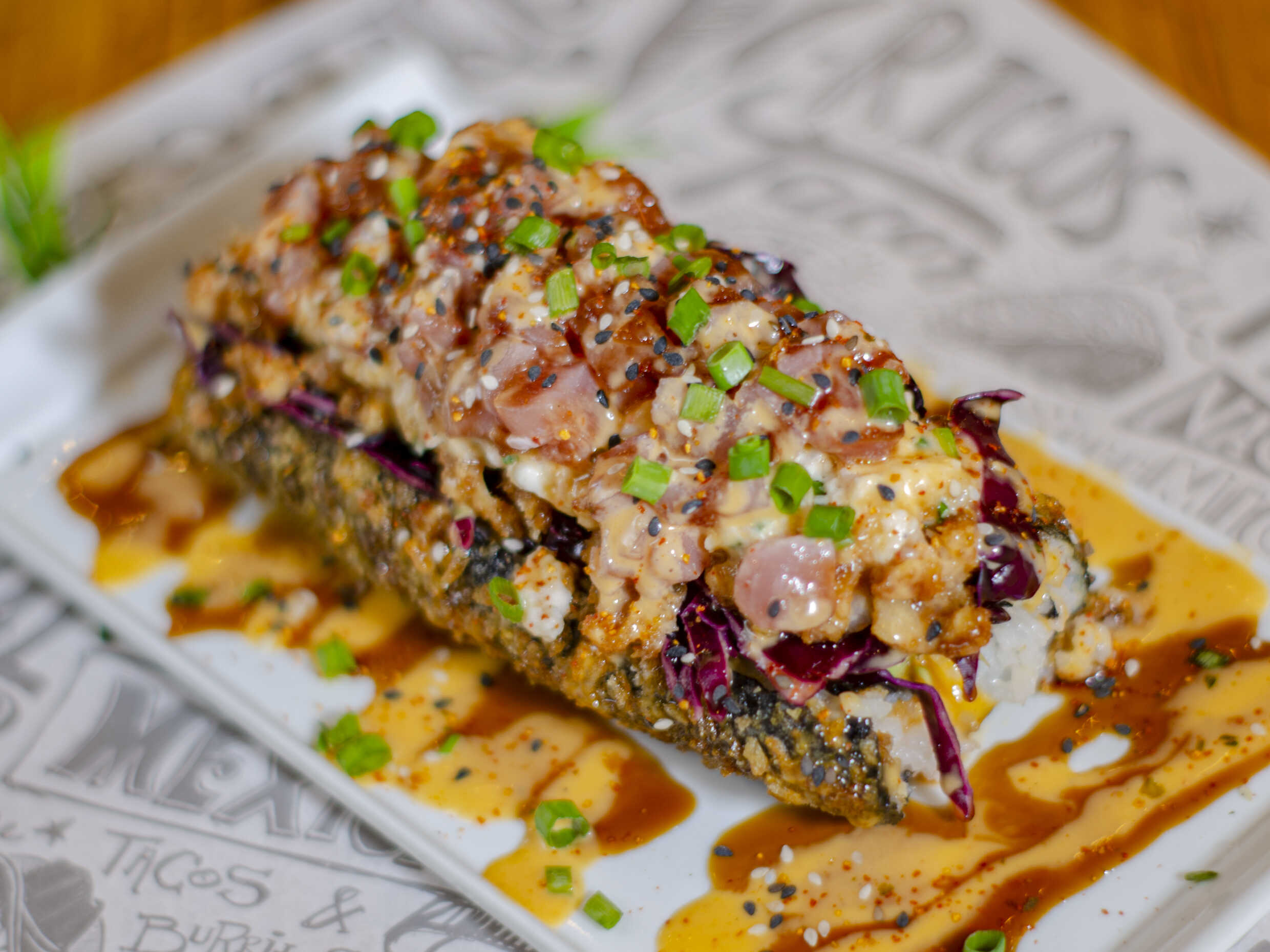Pan hecho de sushi sticky rice, envuelto en nori empanizado, langostinos thai, tartar de atún en spicy japan, tartar de langostinos, pepino, col morada, palta, queso crema y cebolla china.