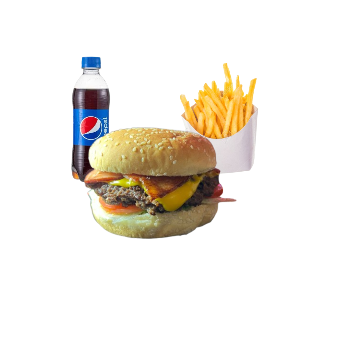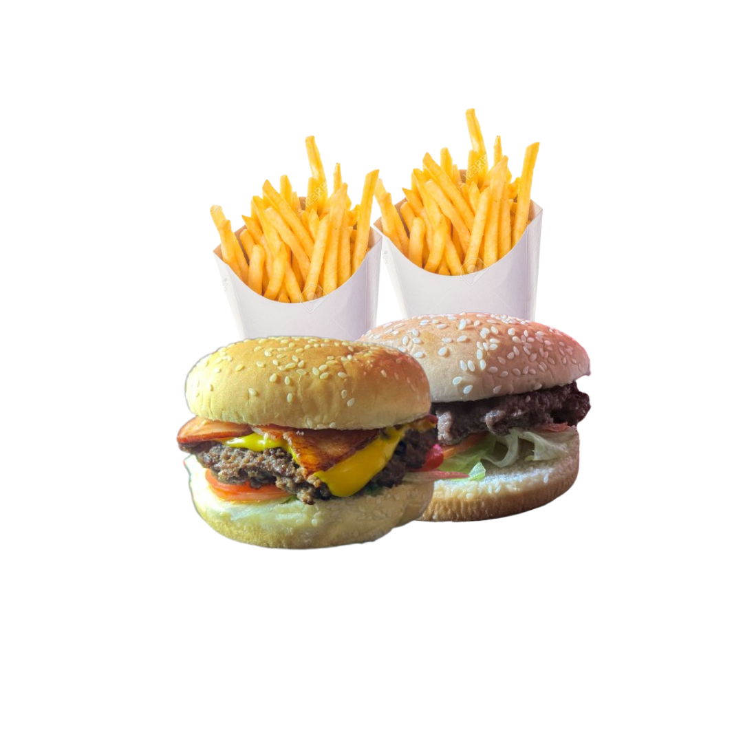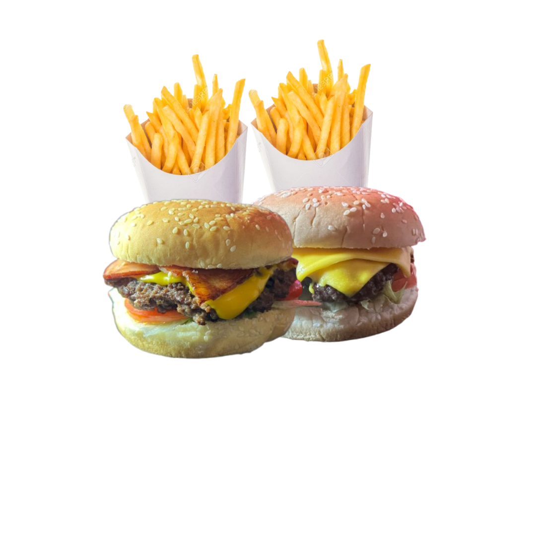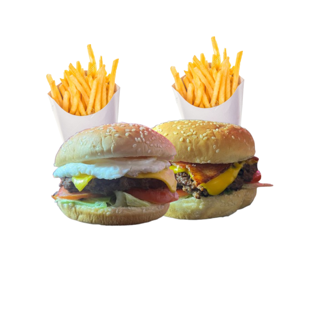 2 burguers, queso, tocino, tomate, lechuga, cremas y 1 papa regular.