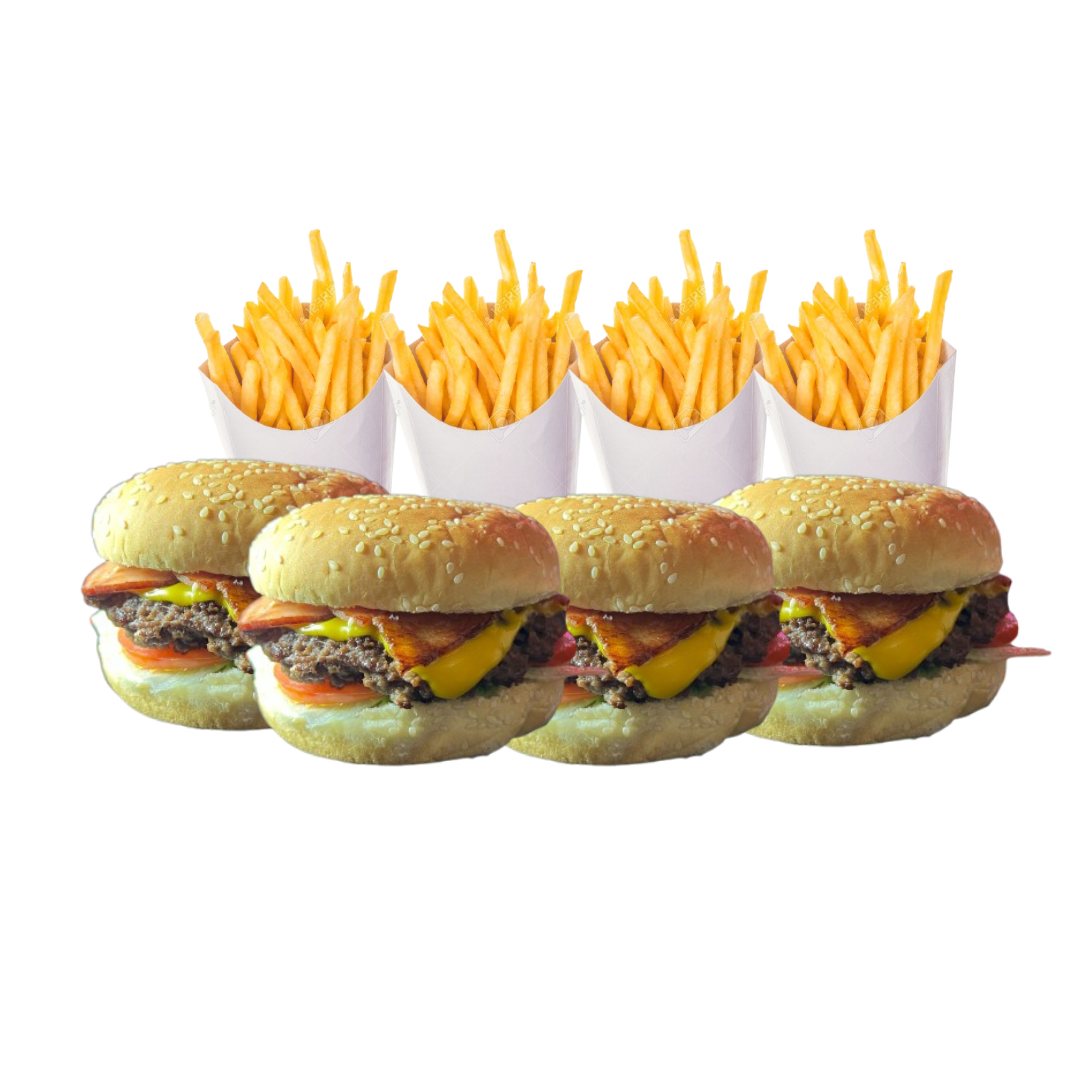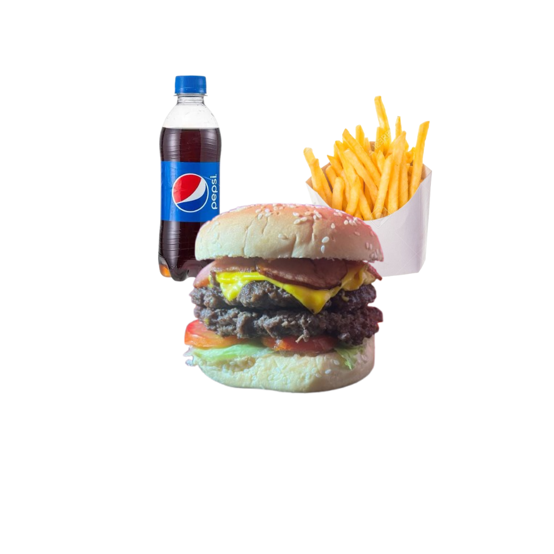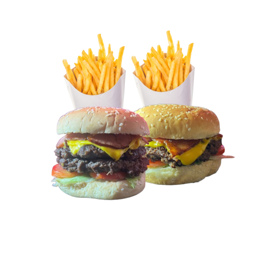 2 burguers, queso, tocino, tomate, lechuga, cremas y 1 papa regular.
