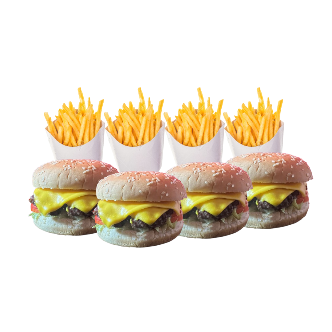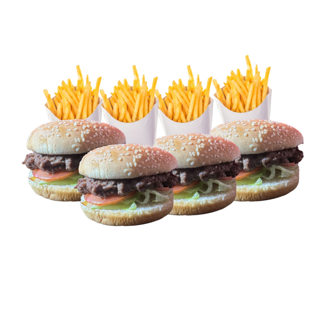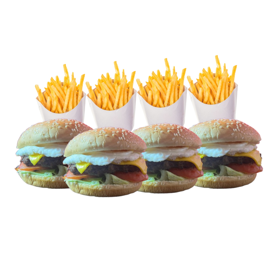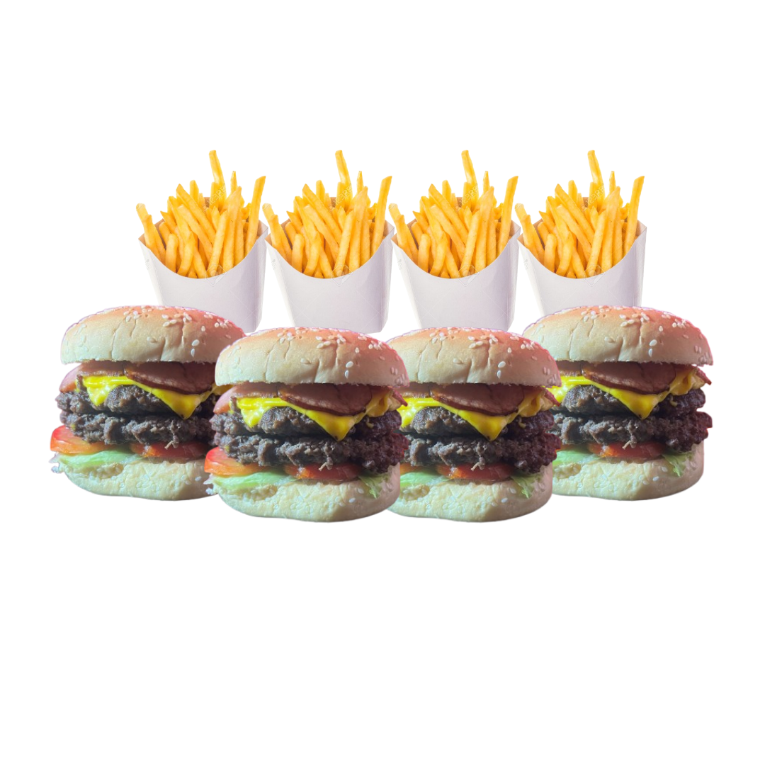2 burguers, queso, tocino, tomate, lechuga, cremas y 1 papa regular.