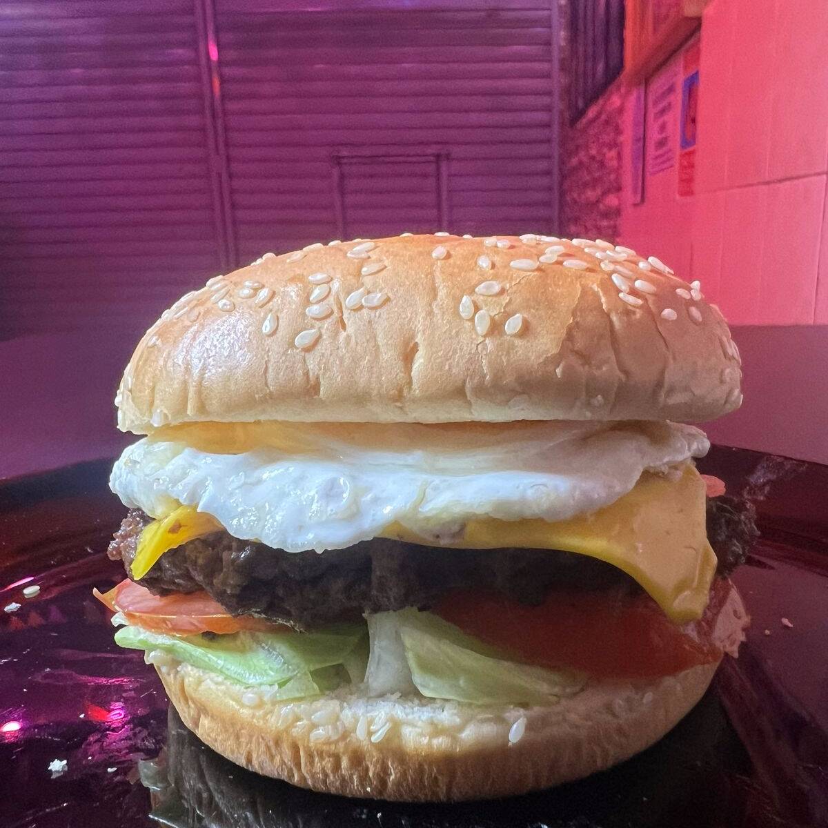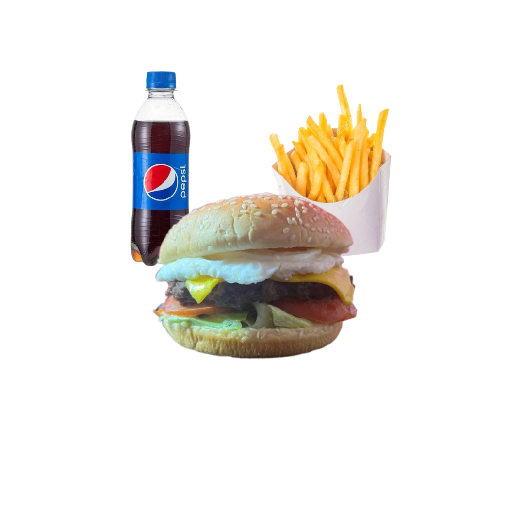 Burguer, huevo, queso, cremas, tomate, lechuga y 1 papa regular.