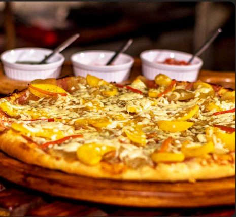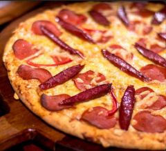Pizza de 12 porciones, con queso mozzarella, salsa pizzera, plátano, cecina ahumada y chorizo ahumado.